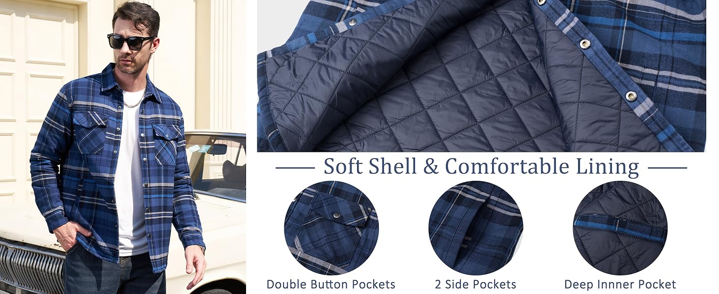 - 5 Pockets: 2 side pockets, 2 chest pockets and 1 inside pocket, which can keep your cell phone, keys and small essentials within reach of this quilted flannel shirt.